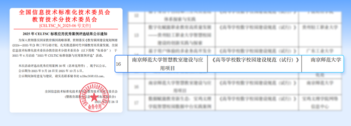 2025年11月16日,教育部教育信息化技術標準委員會(CELTSC)全體會議在三亞召開。會上,30項“2025年CELTSC標準創新與應用優秀案例”獲表彰和頒獎,《南京師范大學智慧教室建設與應用項目》成功入選,成為高校數智化建設的典型實踐。