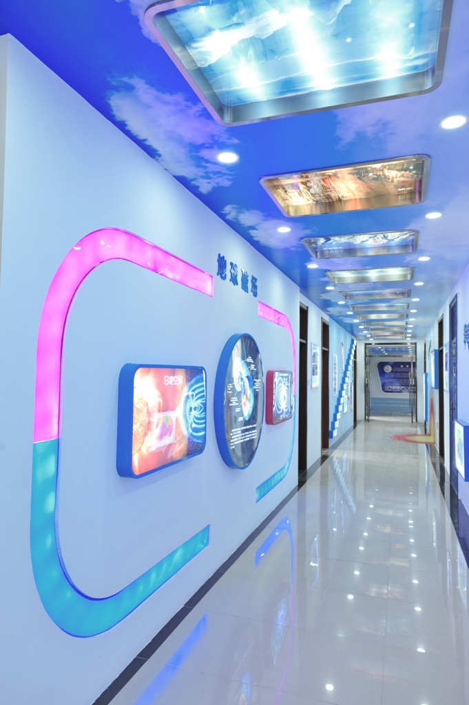 樓道主體設(shè)計思路:從宏觀到微觀運用現(xiàn)代裝修手段,為師生探究地球環(huán)境及地球生物的進(jìn)化過程提供有效素材。頂部藍(lán)天白云和24個世界著名地質(zhì)地貌景觀燈箱有機(jī)組合。兼顧照明作用的同時營造天地合一的神秘感,激發(fā)獵奇興趣和探究欲望。頂部選用深邃的藍(lán)色襯托點點繁星,淡淡的銀河若隱若現(xiàn),黃道12星座有序排列,側(cè)墻上天體演化過程歷歷在目,濃縮地球的宇宙環(huán)境,令人產(chǎn)生無限的遐想。