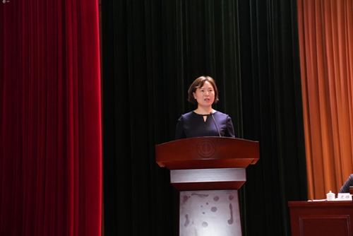 在熱烈的掌聲中,文香董事長朱玉榮作《文香工作報告》。