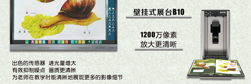 海天地壁掛式視頻展臺B10,高清1200萬像素鏡頭,出色的傳感器,進光量增大,有效抑制噪點,畫質更清晰,為老師在教學時展現更多的影像細節。