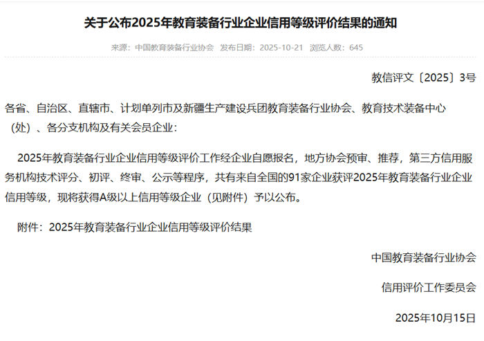 2025年10月,中國教育裝備行業(yè)協(xié)會公布《2025年教育裝備行業(yè)企業(yè)信用等級評價結(jié)果》。