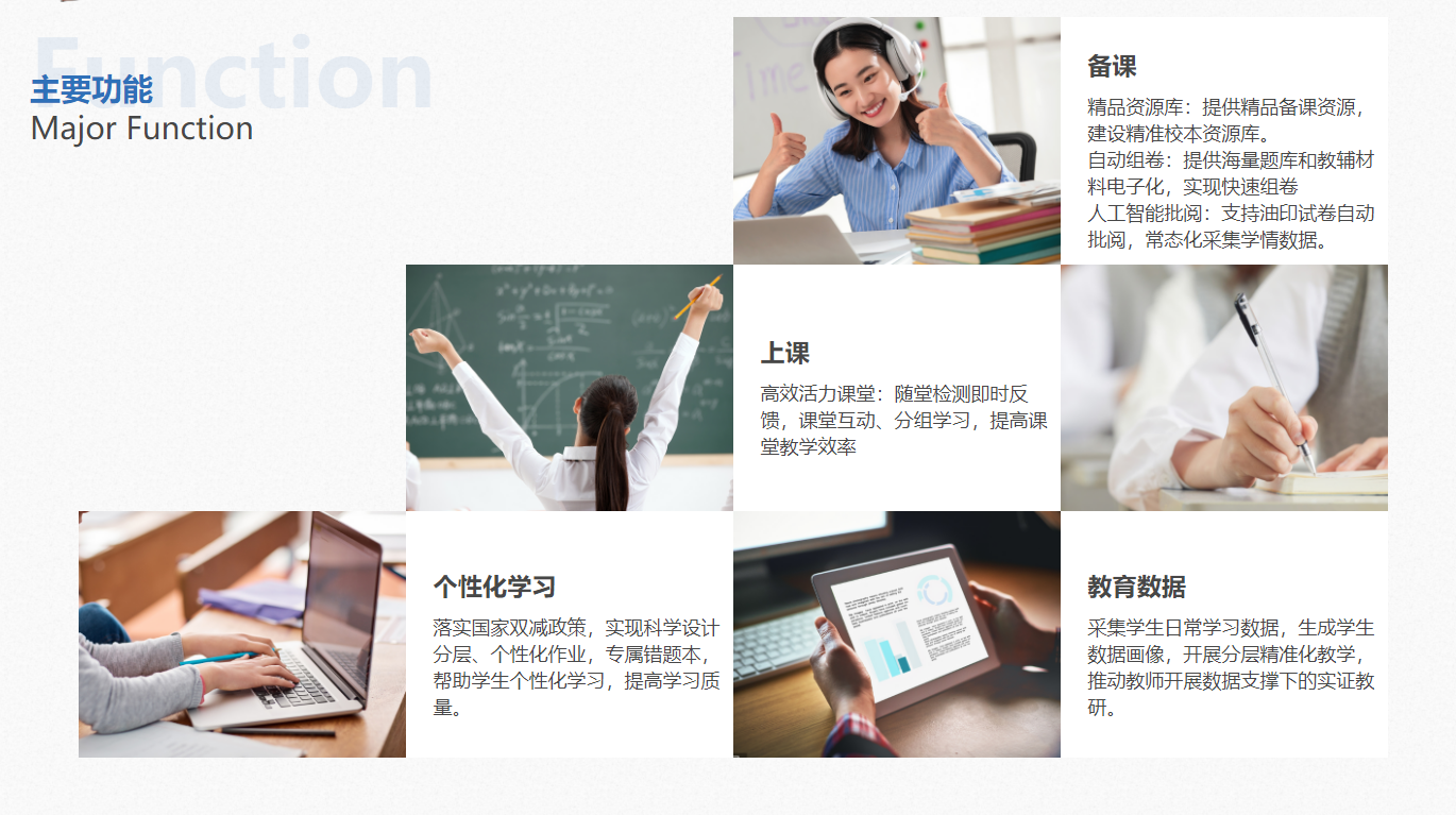 產(chǎn)品詳細(xì)介紹堅(jiān)知果AI課堂,利用學(xué)校原有信息化基礎(chǔ)設(shè)備,不改變學(xué)校紙筆作答教學(xué)習(xí)慣,采用人工智能、大數(shù)據(jù)技術(shù)實(shí)現(xiàn)科學(xué)設(shè)計(jì)分層、個(gè)性化作業(yè),課堂數(shù)據(jù)即時(shí)反饋,提高課堂教學(xué)效率,PAD智能終端設(shè)備無需進(jìn)課堂,即可實(shí)現(xiàn)分層教學(xué)、精準(zhǔn)化教學(xué)。采集學(xué)生日常學(xué)習(xí)數(shù)據(jù),生成專屬錯(cuò)題本、學(xué)生數(shù)據(jù)畫像,助力學(xué)生個(gè)性化學(xué)習(xí)。教研備課平臺(tái)為教師提供海量精品資源,推動(dòng)教師開展數(shù)據(jù)支撐下的實(shí)證教研,為教育管理者教學(xué)改革、教育決策提供科學(xué)準(zhǔn)確的數(shù)據(jù)支撐。