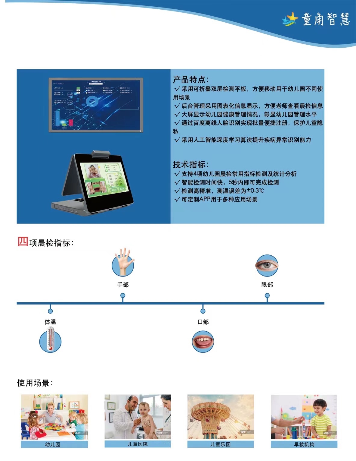 技術指標: √ 支持4項幼兒園晨檢常用指標檢測及統計分析 √ 智能檢測時間快,5秒內即可完成檢測 √ 檢測高精準,測溫誤差為±0.3℃ √ 可定制APP用于多種應用場景 |