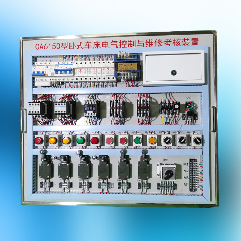 產品詳細介紹CA6150車床控制電路考證板, 模板由15-20mm實芯木板精加工而成,整體噴塑,顏色與實驗臺架協調。面板上裝有斷路器、熔斷器、接觸器、熱繼電器、變壓器等元器件,這些元器件直接安裝在面板表面,可以很直觀的觀看它們的動作情況。走線采用箱內布線,整潔美觀,測試點用內置端子引出,安全美觀。箱上內置故障箱,設有故障開關,有正面開門的暗鎖。箱上提供時控系統,箱上所提供的器件為國內知名品牌,且滿足CA6150車床電路的實驗考核需要。